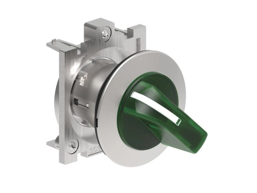 Metalowy przełącznik płaski podświetlany 3 pozycyjny 1-0-2 z samopowrotem do pozycji 0 fi30mm pokrętło krótkie Zielony LPFSL1313