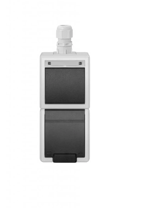 11. AQUANT 2K zestaw natynkowy pionowy łącznik natynkowy 1-biegunowy(schodowy)+gniazdo podwójne z uziemieniem 2x2P+Z IP55 szary 5062 81.82