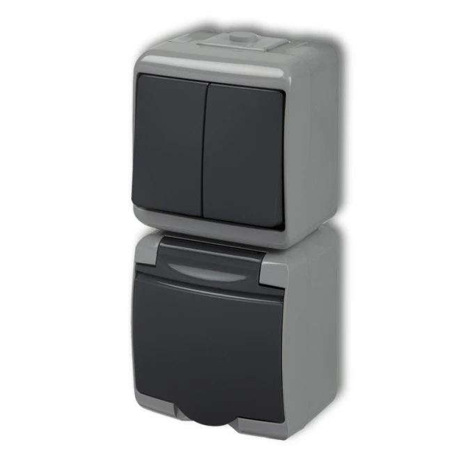 JUNIOR Łącznik schodowy z gniazdem hermetycznym (klapka grafitowa) popielaty / grafitowy 30WGHP-3p