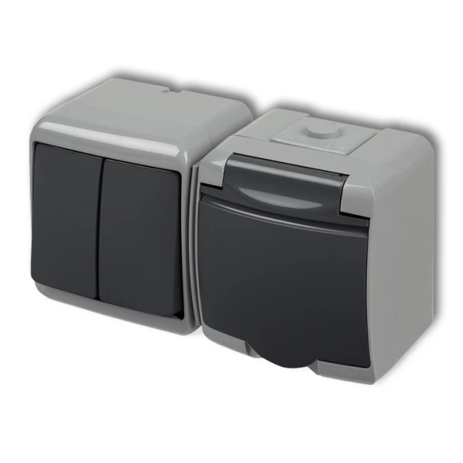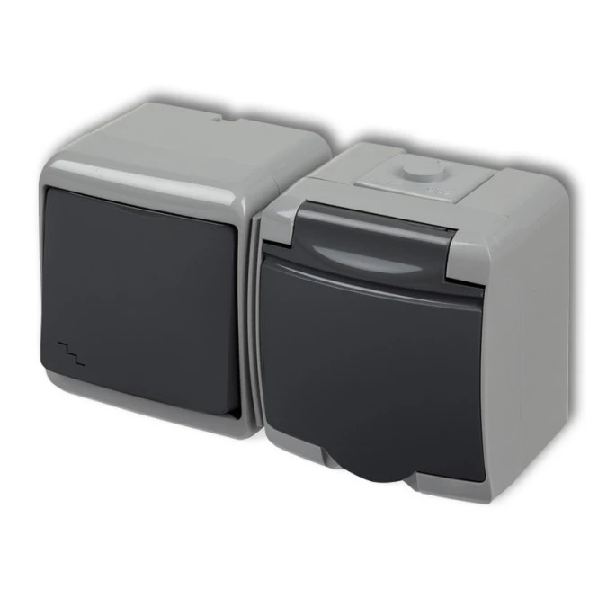 11. JUNIOR Łącznik schodowy z gniazdem hermetycznym (klapka grafitowa) popielaty / grafitowy 30WGHP-3p 40.15