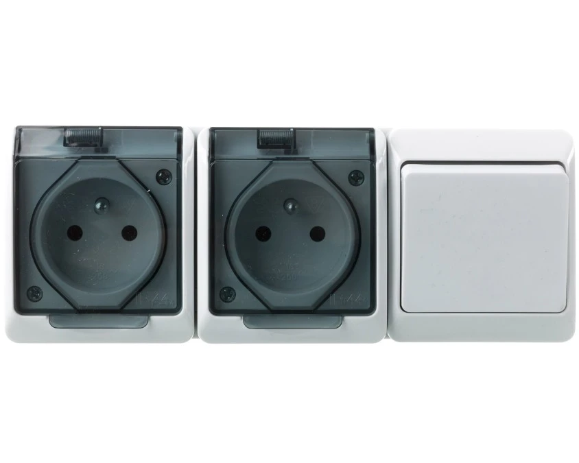 Łącznik schodowy pojedynczy natynkowy + gniazdo 2x 2p+Z Schuko bryzgoszczelny IP44 biały HERMES ELEKTRO-PLAST NASIELSK
