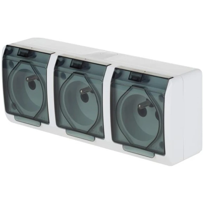 13. Gniazdo zasilające potrójne natynkowe hermetyczne IP44 białe z klapką transparentną 3x 2P+Z 16A HERMES ELEKTRO-PLAST NASIELSK 56.91