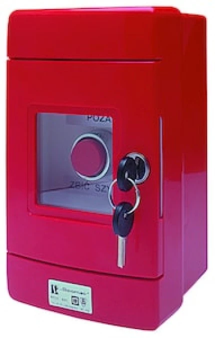 Przycisk bezpieczeństwa 1R czerwony w obudowie OBC pierścień niklowany z młoteczkiem SP22-B-01/OBC/BM