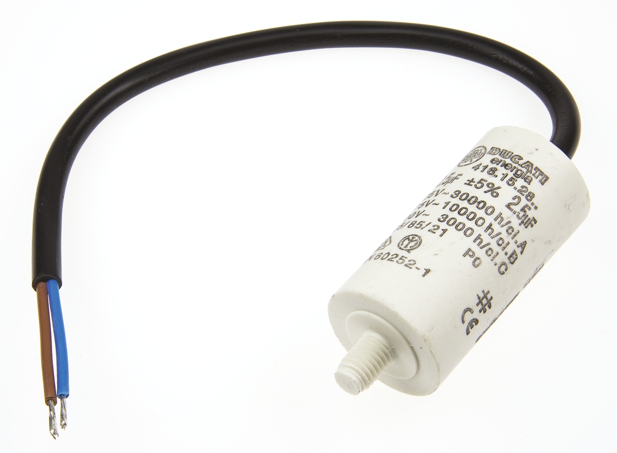 15. Kondensator; silnikowy (rozruchowy); 412803428; 267uF; 250V AC; fi 52x105mm; konektory 6,3mm; śruba bez nakrętki; Ducati; RoHS 75.11