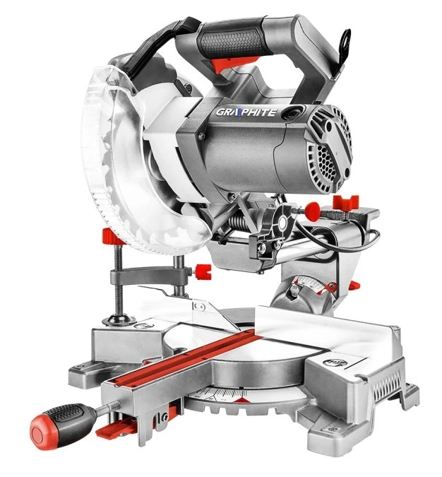 6. Piła, pilarka ukosowa sieciowa 230V 1400W z funkcją posuwu, tarcza 185x16mm w zestawie z akcesoriami GRAPHITE 59G800 743.02