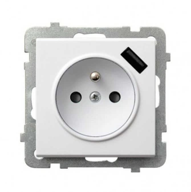 SONATA Gniazdo pojedyncze z uziemieniem z przesłonami torów prądowych, z ładowarką USB biały mat GP-1RZPUSB/m/75