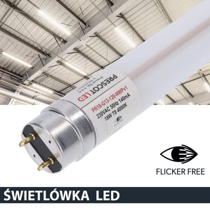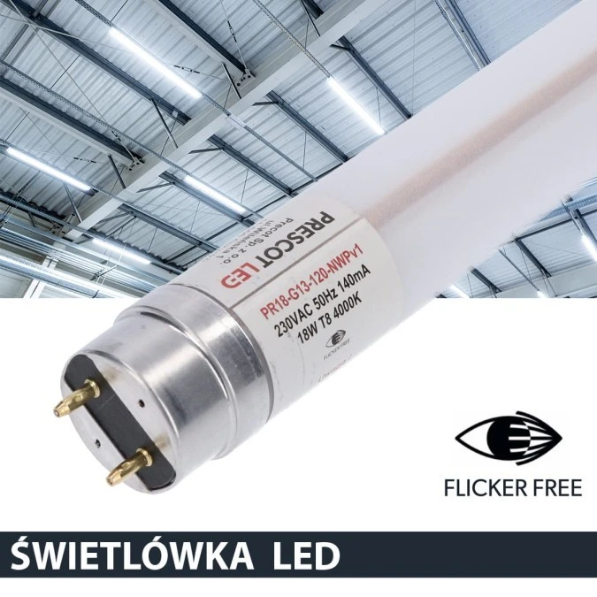 1. Świetlówka led T8 G13 120cm 18W 6500K 1800lm PC Prescot Flicker free 7.04