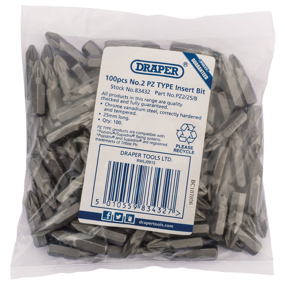 Draper 83432 No.2 PZ TYPE 1/4" Insert Bits (Bag of 100)