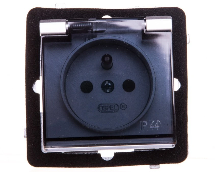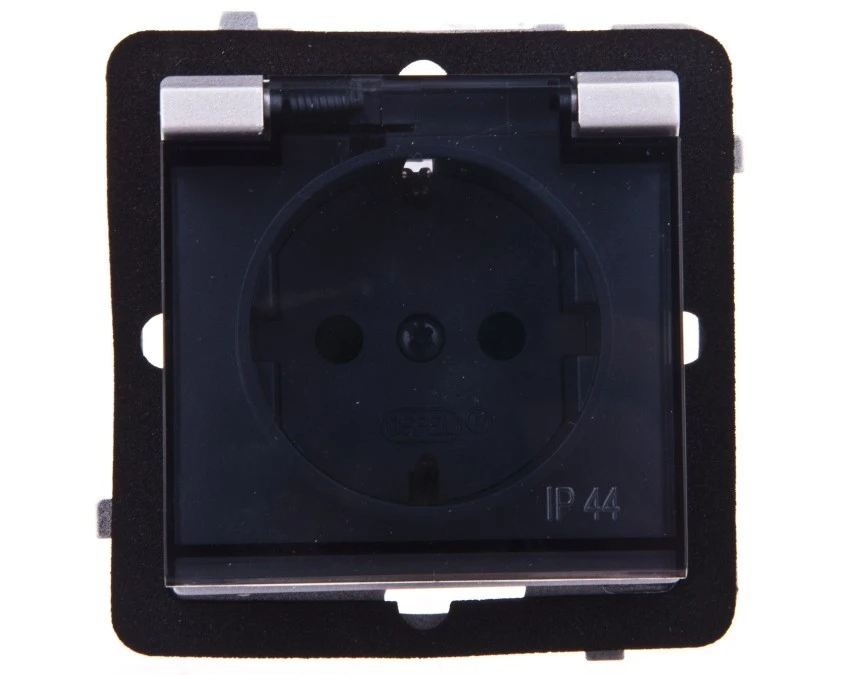 5. SONATA Gniazdo bryzgoszczelne z/u IP44 z przesłonami klapka przezroczysta srebro mat GPH-1RZP/m/38/d 35.56