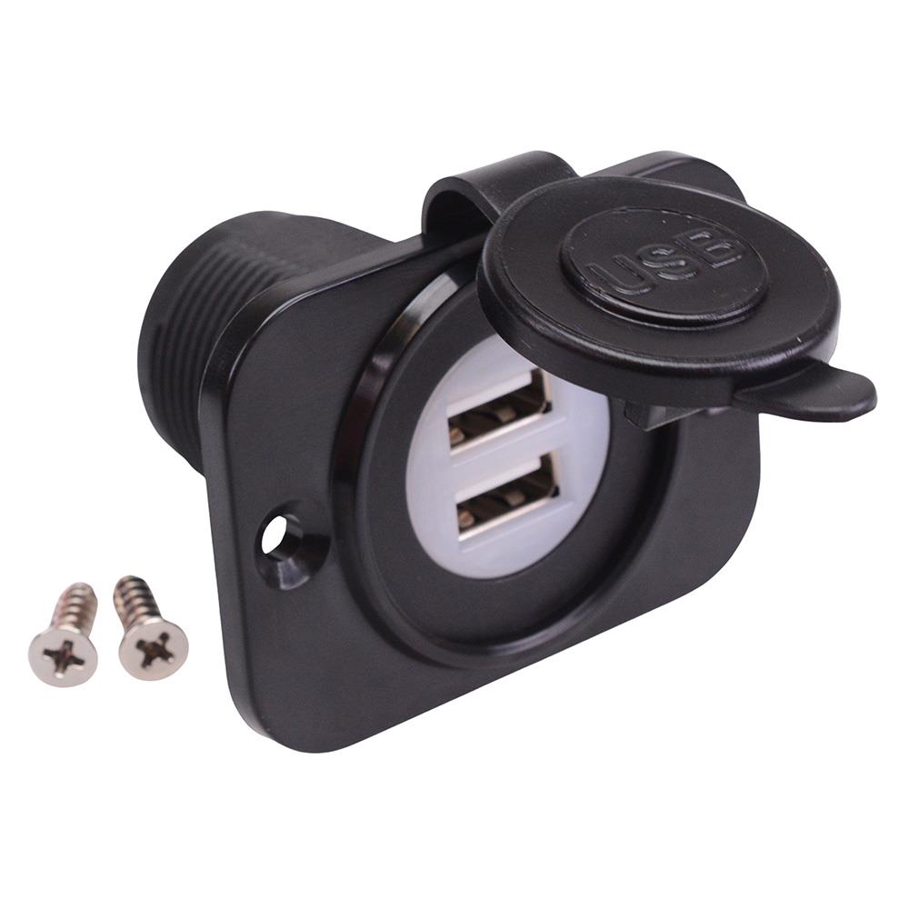 Dual USB-A 5V 2.1A Panel Mount Socket with LED & Flange A13-194BPS-BB3