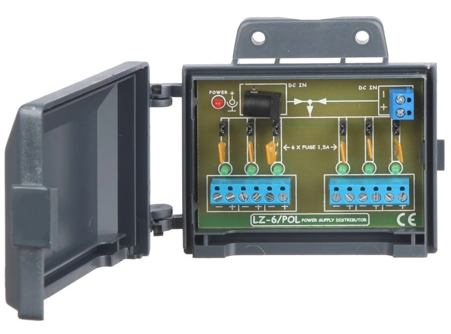 9. Dystrybutor zasilania (łączówka, rozgałęźnik) 2-we/6-wy max.24VDC 9A bezpiecznik 6x1,5A obudowa na ścianę LZ-6/POL 49.52