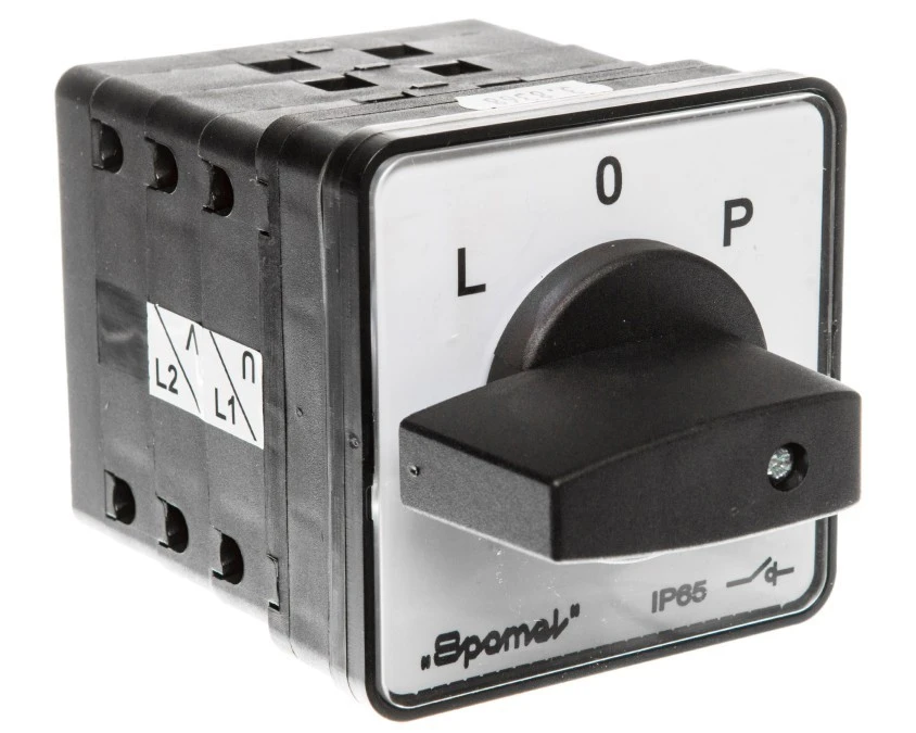 Łącznik krzywkowy 80A przełącznik zmiany kierunku obrotów L-O-P mocowany do pulpitu czoło szare pokrętło czarne SK80-3.8368\P03