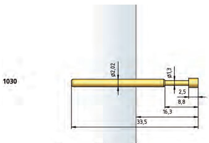 15. ICT spring contact with probe, waffle, Ø 1.65 mm, travel  5.3 mm, pitch 2.54 mm, L 32.3 mm, 2021-C-2.25N-AU-2.0 19.84