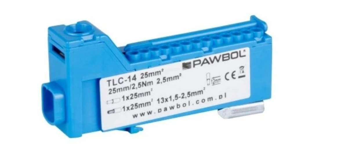 5. Listwa zaciskowa bezgwintowa LZB niebieska 14-torowa 63A na szynę DIN TH35 (1x 25mm2 + 13x 2,5mm2) PAWBOL 35.31