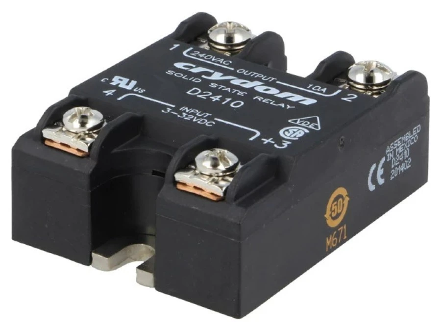 10. Solid state relay, 24-280 VAC, zero voltage switching, 3-32 VDC, 50 A, PCB mounting, D2450PG 343.25