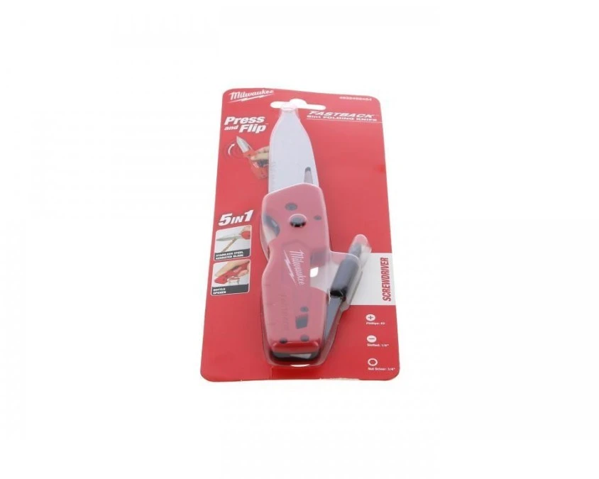Nóż składany z wymiennym ostrzem trapezowym 6w1 (ściągacz izolacji, uchwyt na bity, śrubokręt, otwieracz) FASTBACK MILWAUKEE