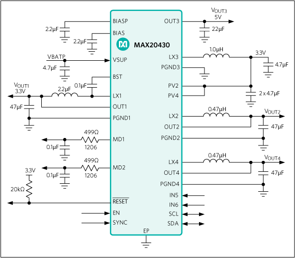 The MAX20430 is a high-efficiency, four-output DC- ...