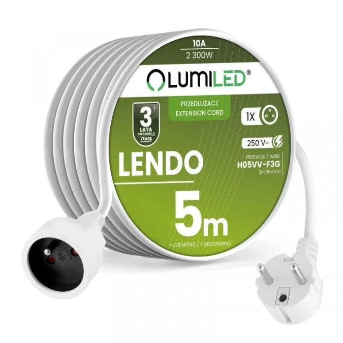 Przedłużacz Sieciowy Kabel z Uziemieniem Listwa Zasilająca 1 Gniazdo 5m Biały Sznur Lendo Lumiled