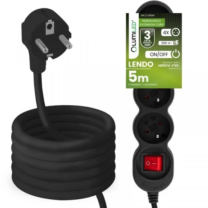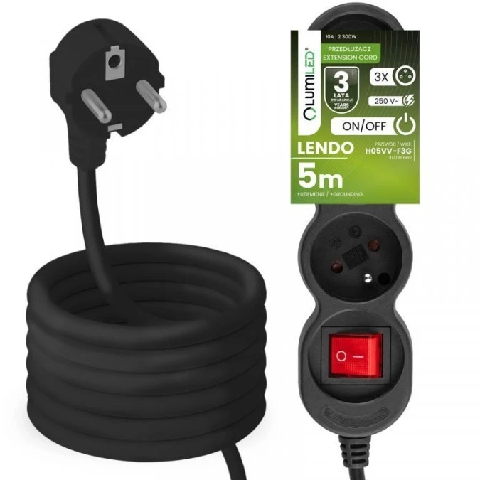 Przedłużacz Sieciowy Kabel z Uziemieniem Listwa Zasilająca 3 Gniazda 5m Włącznik ON/OFF Czarny Sznur Lendo Lumiled