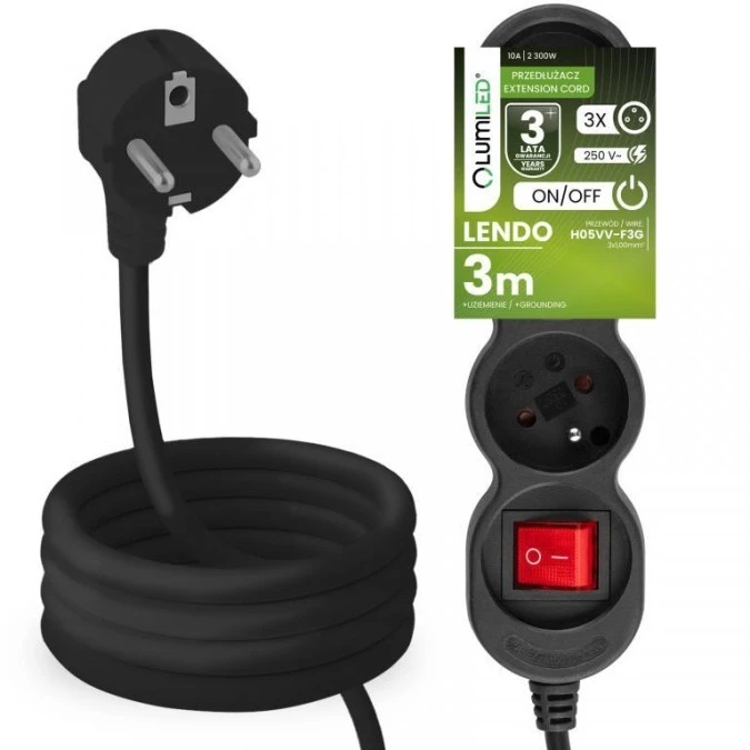 Przedłużacz Sieciowy Kabel z Uziemieniem Listwa Zasilająca 3 Gniazda 3m Włącznik ON/OFF Czarny Sznur Lendo Lumiled