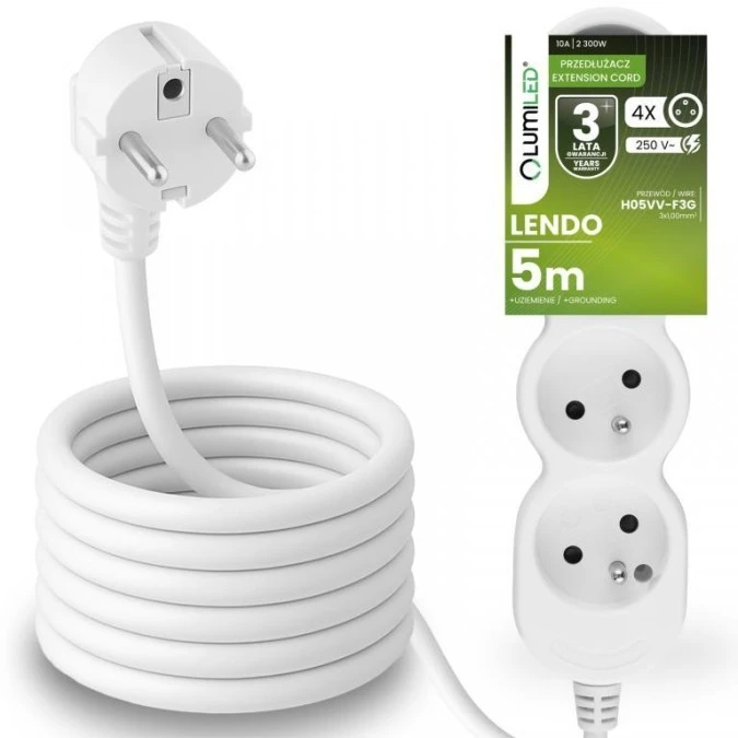 Przedłużacz Sieciowy Kabel z Uziemieniem Listwa Zasilająca 3 Gniazda 5m Biały Sznur Lendo Lumiled