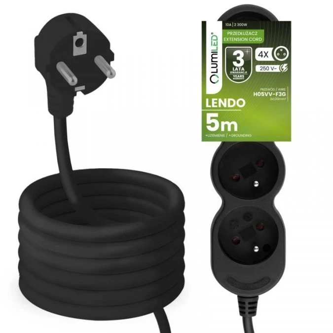 Przedłużacz Sieciowy Kabel z Uziemieniem Listwa Zasilająca 3 Gniazda 5m Czarny Sznur Lendo Lumiled