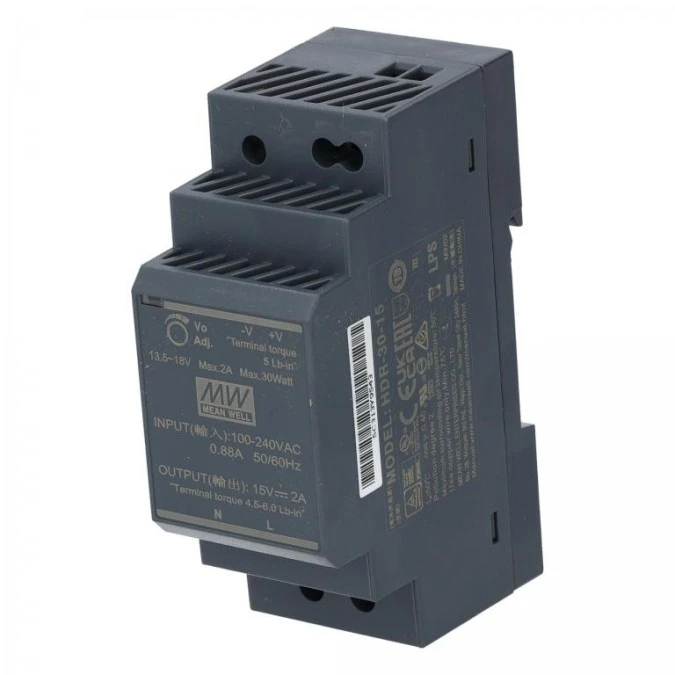 14. Zasilacz na szynę DIN 15V 2A 30W uniwersalny SLIM (2-modułowy) HDR Mean Well 78.73
