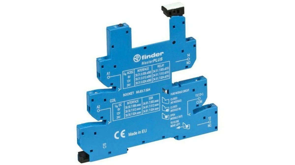 2. Wąskoprofilowe gniazdo 6,2mm do przekaźników serii 34 – MasterPLUS, 6-24V DC, zaciski śrubowe, montaż na szynę DIN 93.63.7.024 44.05