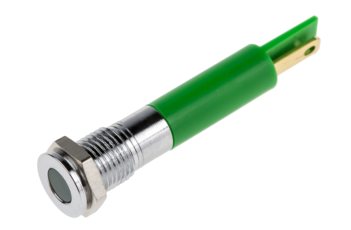 5. Lampka kontrolna do montażu panelowego 12V dc, zielona 8mm LED Chrom Faston, oczko lutownicze RS PRO 85.85