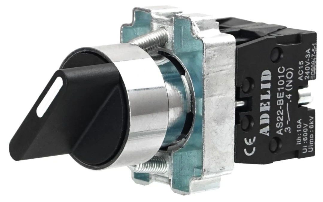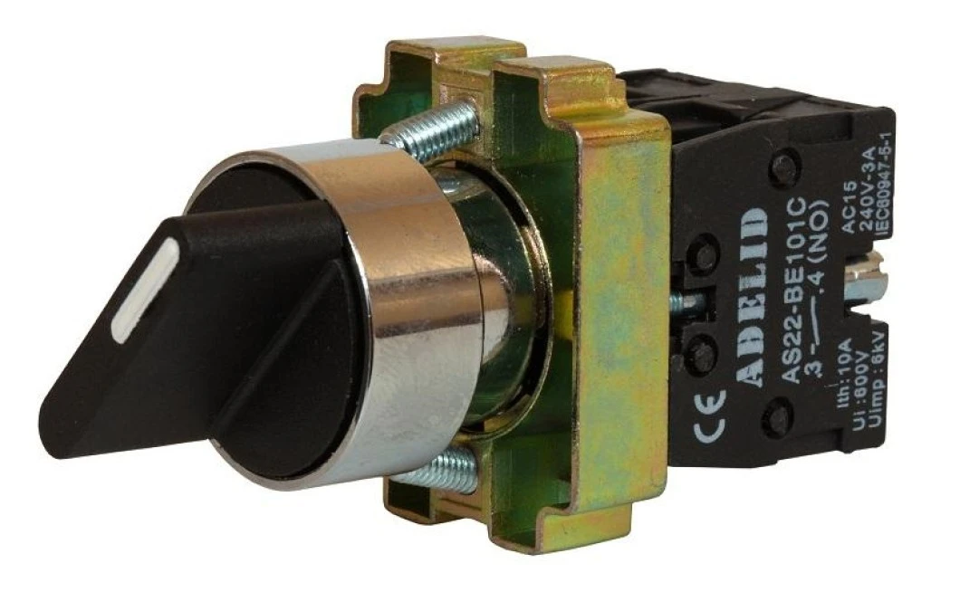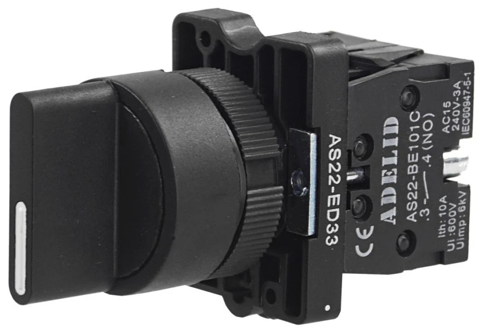 12. Przełącznik 1-O-1 AS22-ED33 2NO piórkowy czarny fi=22mm 10A 600V, AC15 240V 3A ADELID 14.00