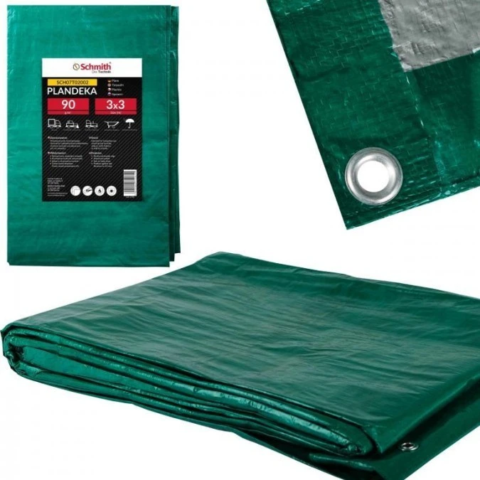 10. Plandeka 3x3 90g zielona gruba wzmacniana z oczkami płachta Schmith 18.76