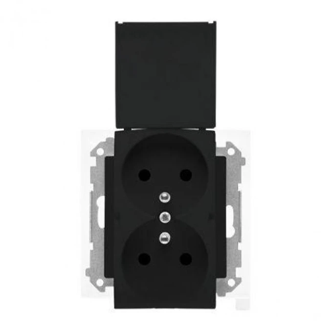 Gniazdo zasilające podwójne SIMON 55 z klapką i uszczelką IP44 czarne matowe 2x [2P+Z] 16A z przesłonami Kontakt Simon TGZ2BMCZ.