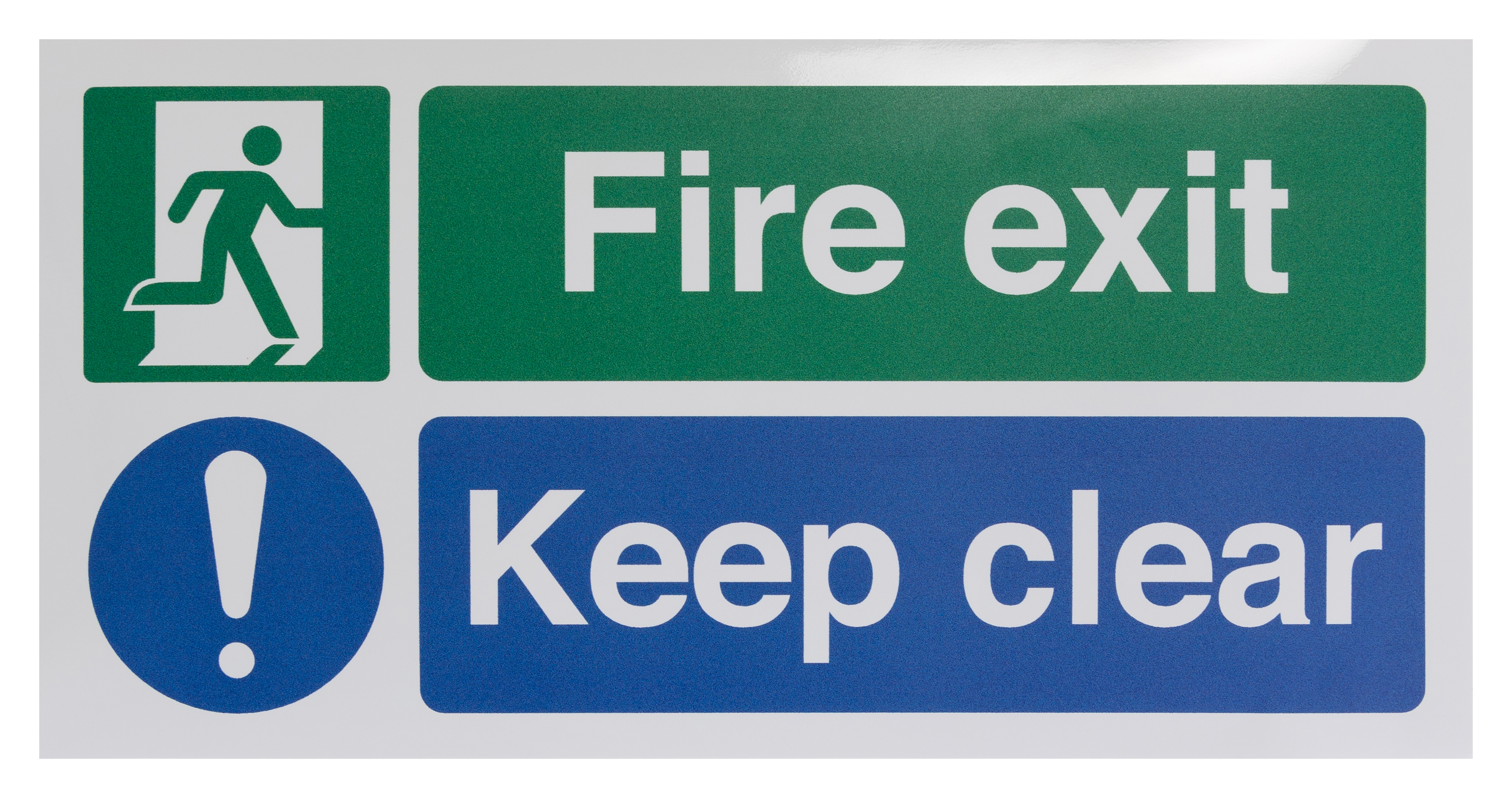 15. Znak wyjścia, Poliester winylowy, Niebieski/zielony/biały, Fire Exit, Keep Clear, Angielski, Opis: Nie zastawiać 39.61