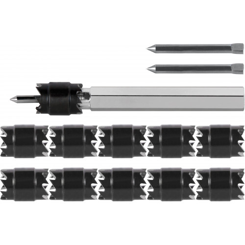 ... , 2 zapasowymi wiertłami i 5 zapasowymi frezami ...