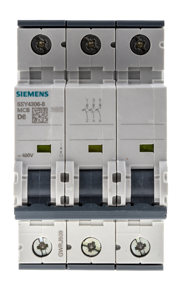 8. Wyłącznik nadprądowy MCB, Typ D, 3-biegunowy, 6A, 400V, na szynę DIN, Siemens, 5SY4 1039.81