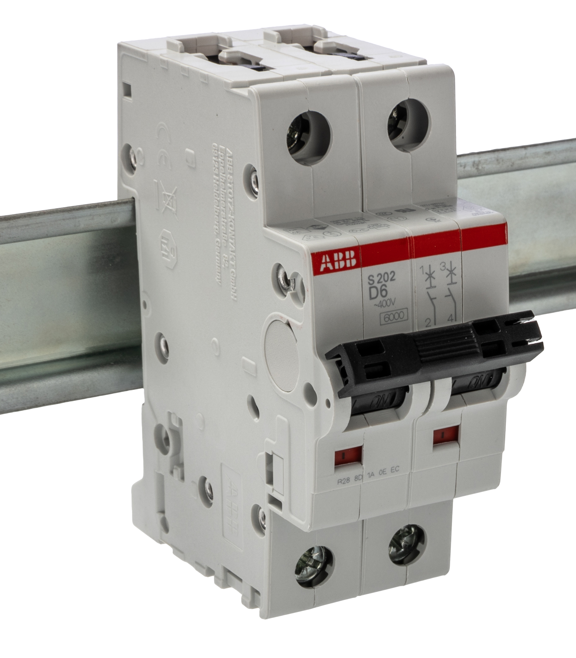 Wyłącznik nadprądowy MCB, Typ D, 2-biegunowy, 6A, 400V, 125V, na szynę DIN, ABB S202-D6, S200