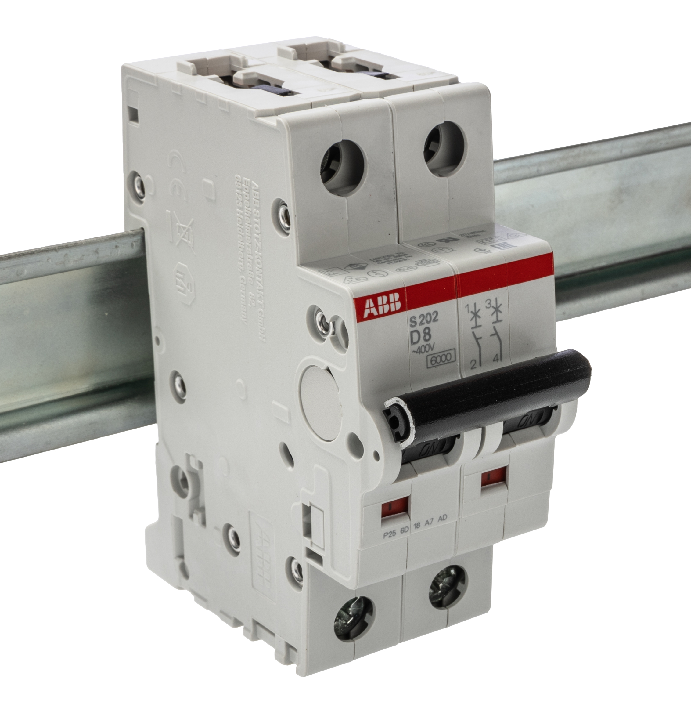 9. Wyłącznik nadprądowy MCB, Typ D, 2-biegunowy, 8A, 400V, 125V, na szynę DIN, ABB S202-D8, S200 305.86