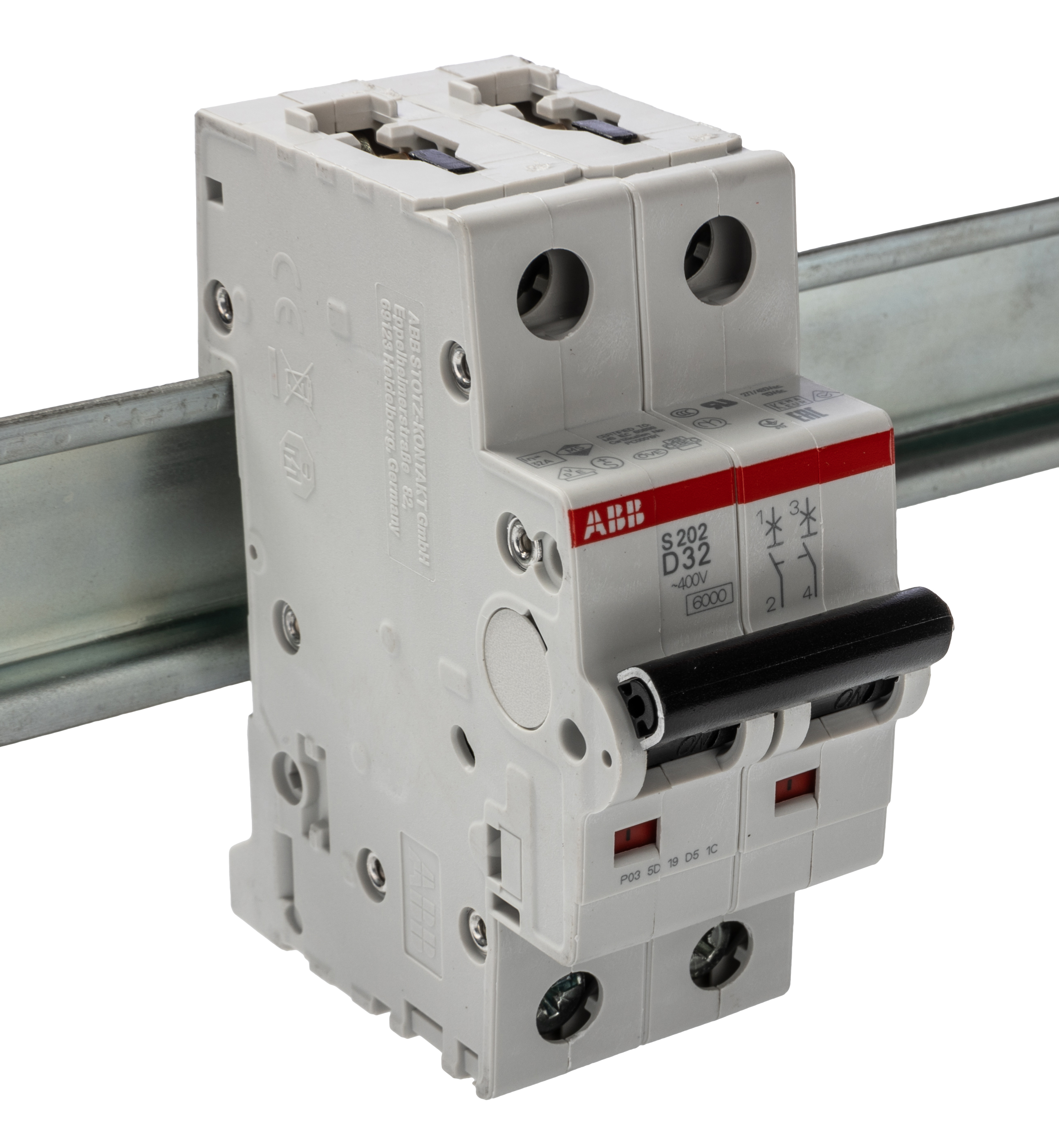 5. Wyłącznik nadprądowy MCB, Typ D, 2-biegunowy, 32A, 400V, 125V, na szynę DIN, ABB S202-D32, S200 304.02