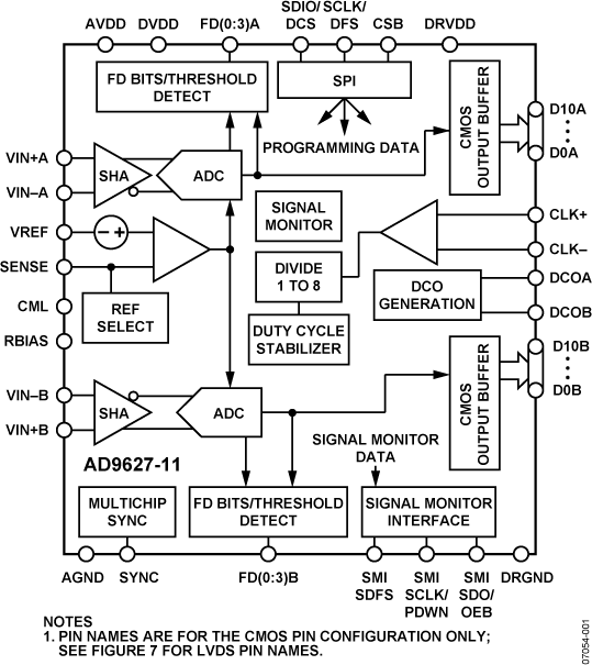 The AD9627-11 is a dual, 11-bit, 105 MSPS/150 ...
