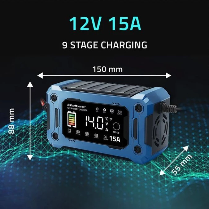 8. Qoltec Inteligentna mikroprocesorowa ładowarka 12V 15A Prostownik z funkcją naprawy i podtrzymania zasilania podczas wymiany aku 115.96