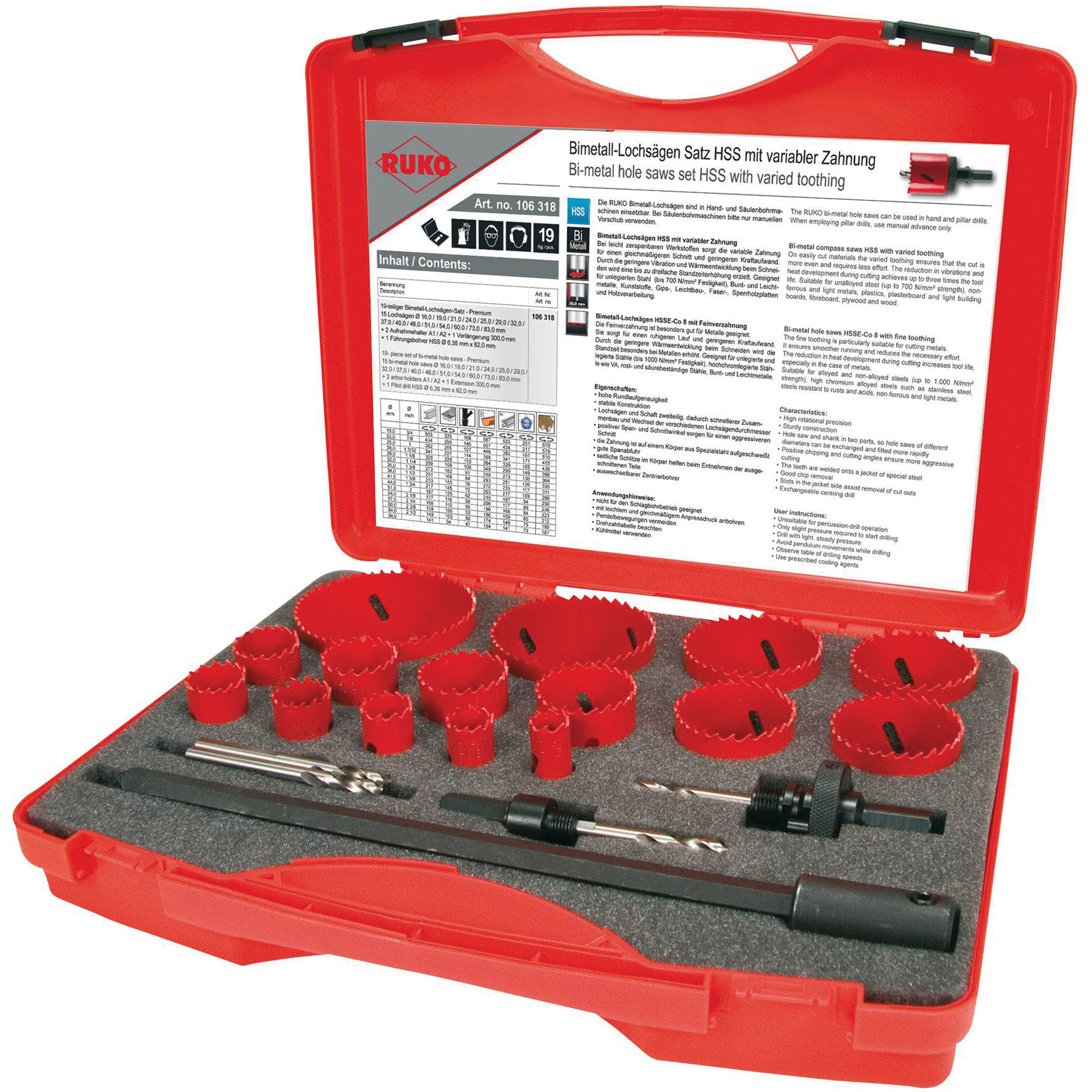 RUKO 126304 Hole Saw Set 12-Piece Bimetal HSSE-Co 8 Plastic Case
