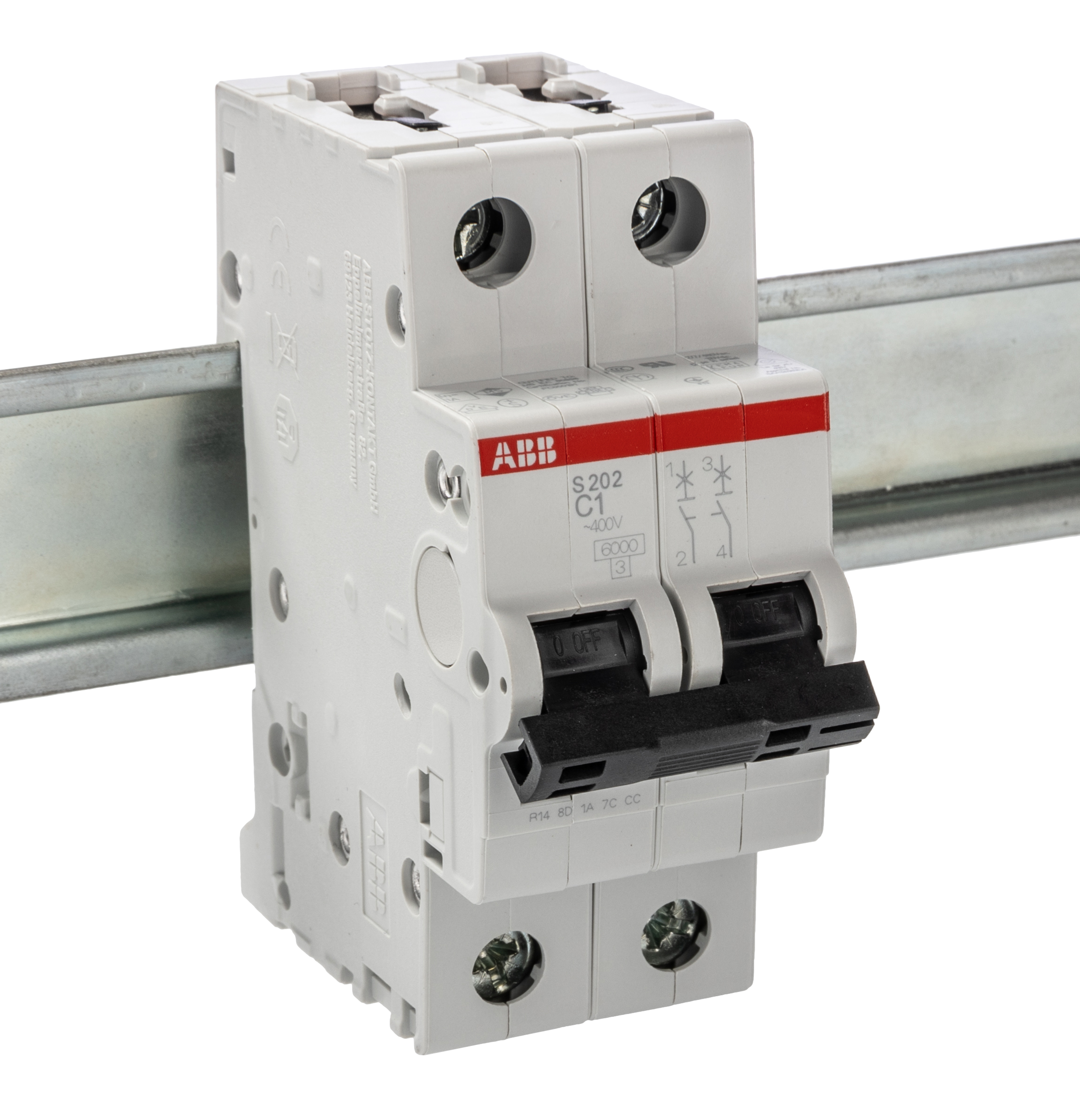 Wyłącznik nadprądowy MCB, Typ C, 2-biegunowy, 1A, 400V, 125V, na szynę DIN, ABB S202-C1, S200