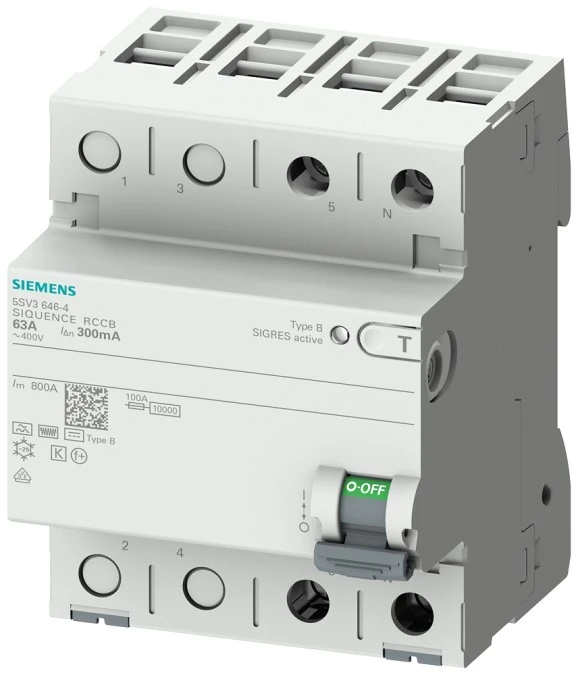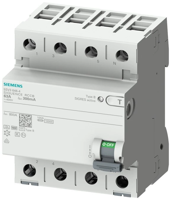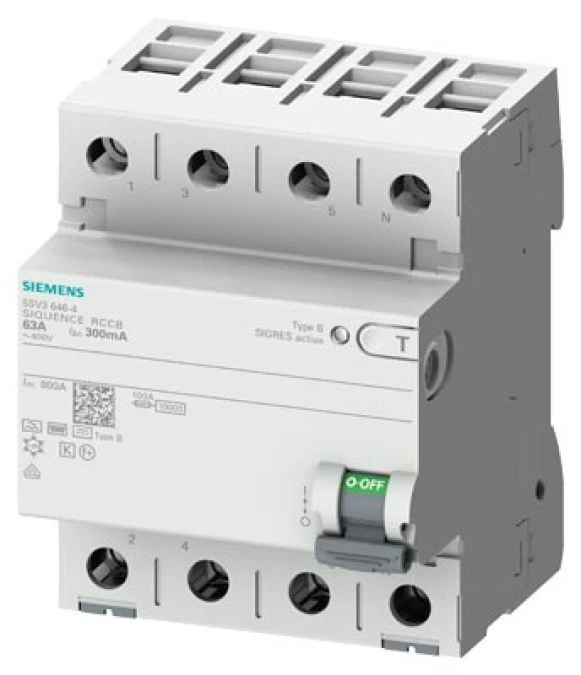 13. Wyłącznik różnicowoprądowy 4P 63A 0,3A Typ B zwłoczny/krótkozwłoczny 400V 300mA SENTRON 5SV3646-4 6103.42