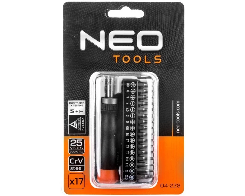 5. Zestaw końcówek wkrętakowych z uchwytem 17 sztuk: wkrętakowe, płaskie, krzyżowe, Torx, HEX NEO 04-228 72.93
