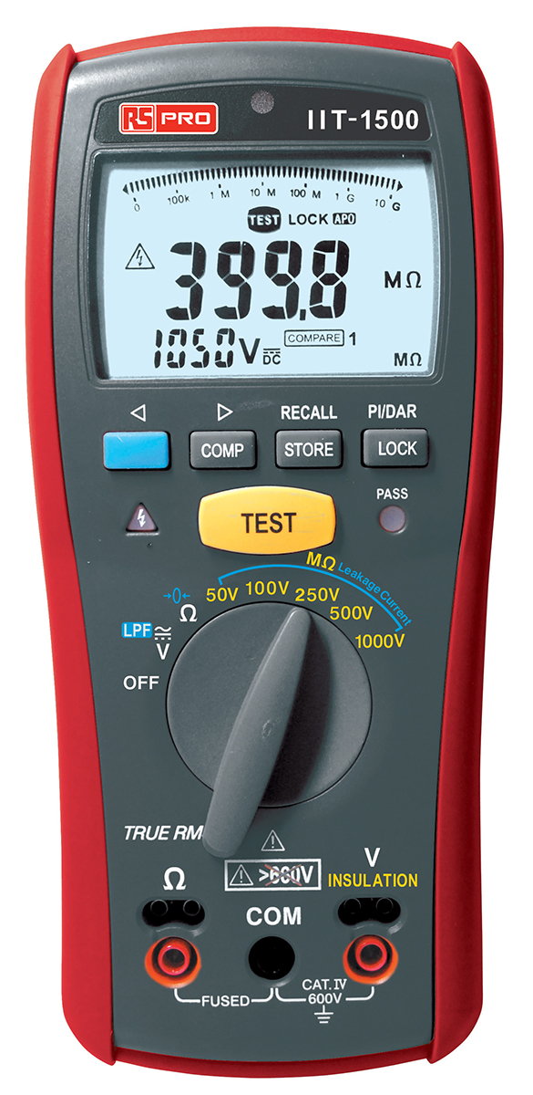 1. Tester izolacji IIT1601, 4GΩ, 1mA, Umax 1000V, z kalibracją DKD, RS PRO 2721.65