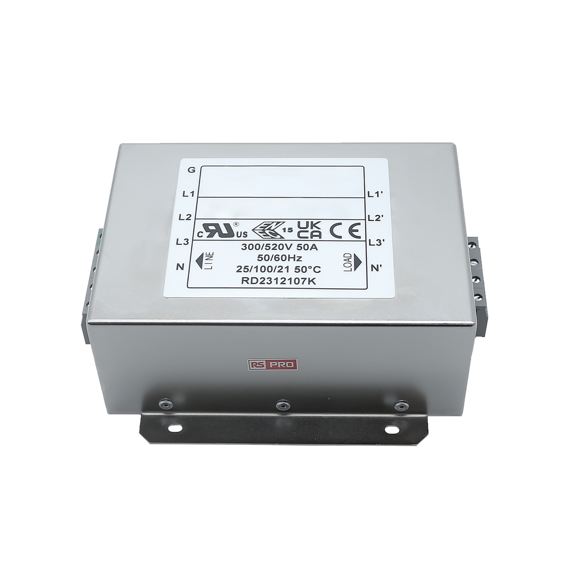 1. Filtr sieciowy 50A 3-fazowy 330kΩ 300/520 V AC 50 → 60Hz 4 x 0,6mH RS PRO Montaż w obudowie 1818.12