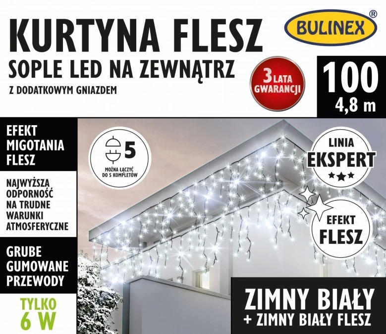 2. Kurtyna świetlna zewnętrzna flesz 100l kurtyna sople z dod.gniazdem 4,9m dekoracji+1,5 m przew. zasilaj. biały/biały flash 199.75