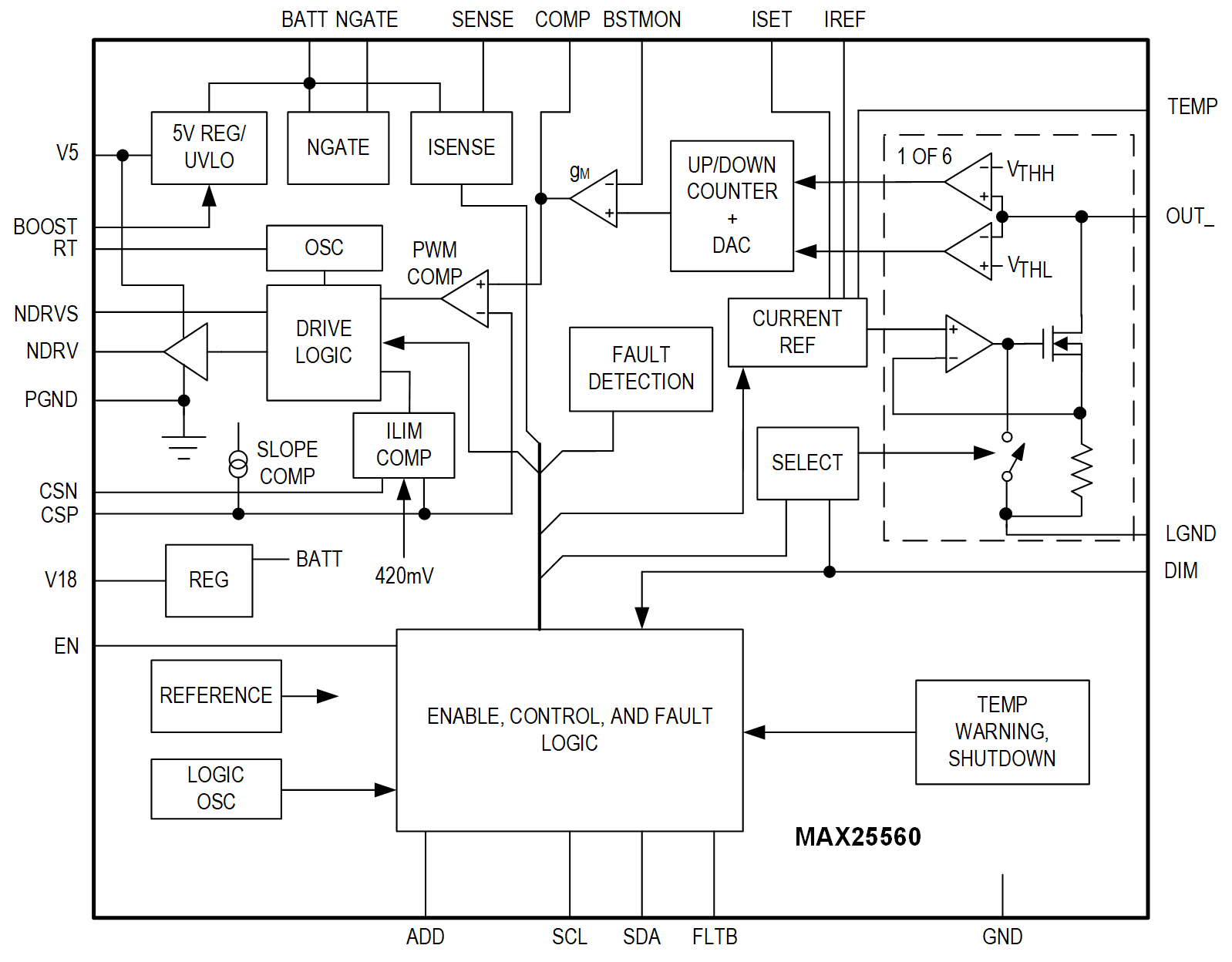 6 x 220mA, ASIL B LED Backlight Driver with Boost Controller