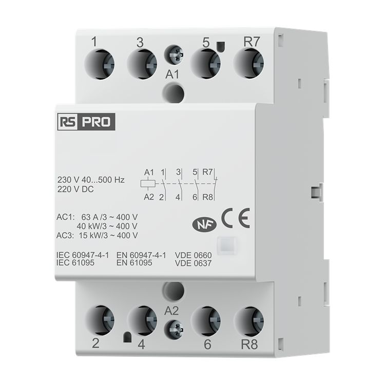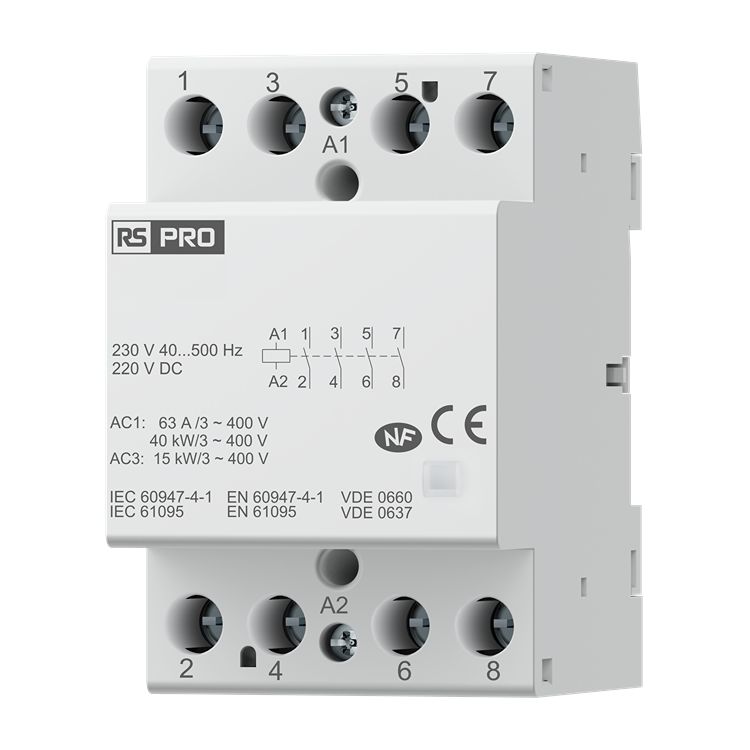 8. Stycznik instalacyjny 220 V DC, 230 V AC RS PRO styki: 4 63 A 3NO/1NC 843.58