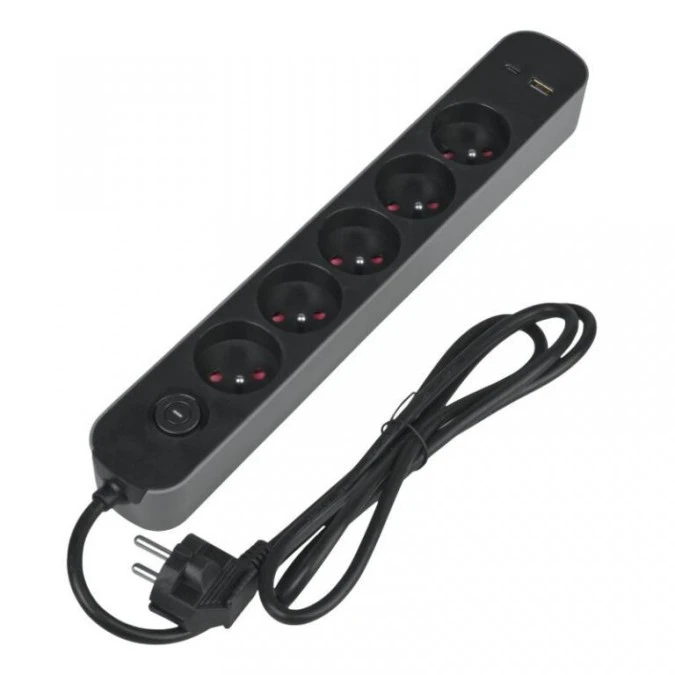 4. Listwa ochronna DPM z wyłącznikiem - 5 gniazda AC, 1x USB-A, 1x USB-C 1,5M szara 49.82